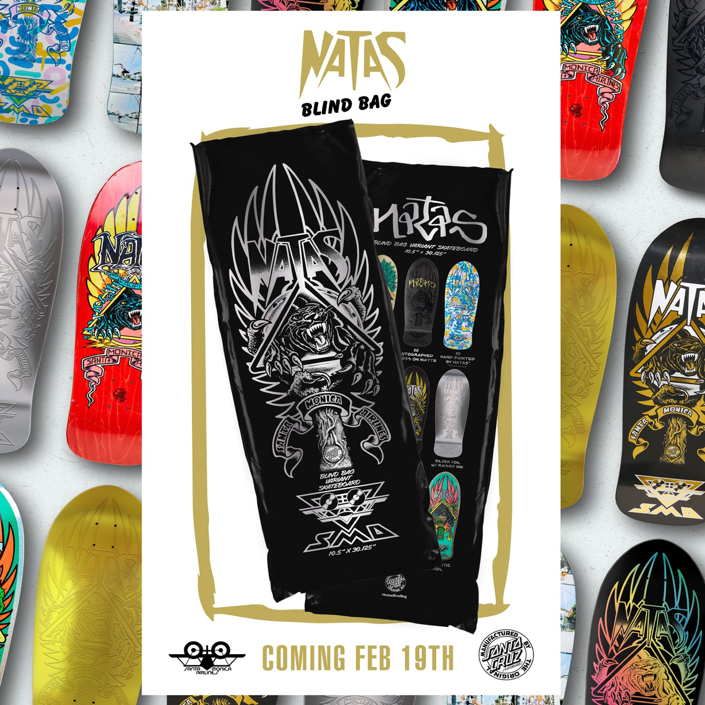 EACH SEALED BLIND BAG CONTAINS A RANDOMLY ASSORTED VARIANT SKATEBOARD FEATURING A CLASSIC NATAS PANTHER SMA REISSUE GRAPHIC